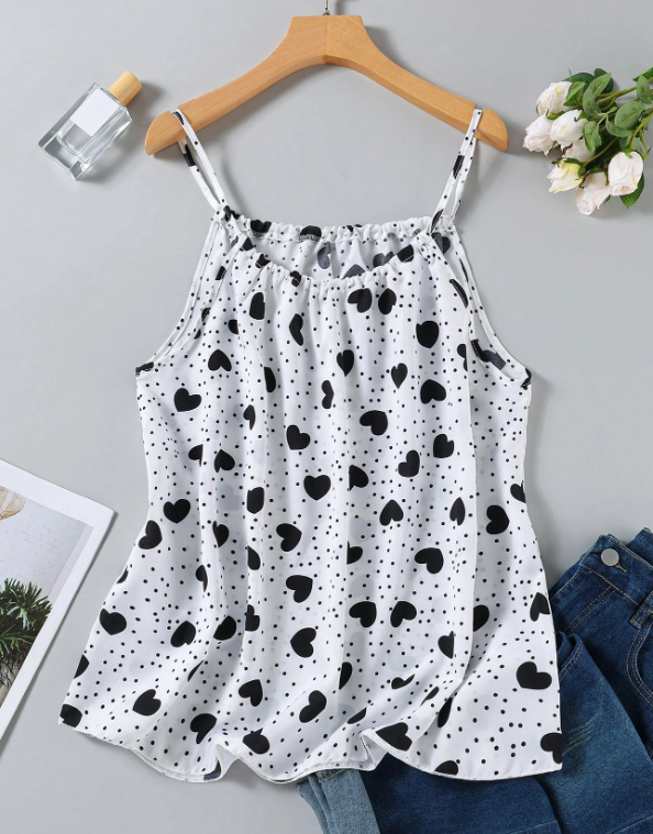 Top de tirantes finos con estampado de corazones todo sobre, informal, para mujer de talla grande