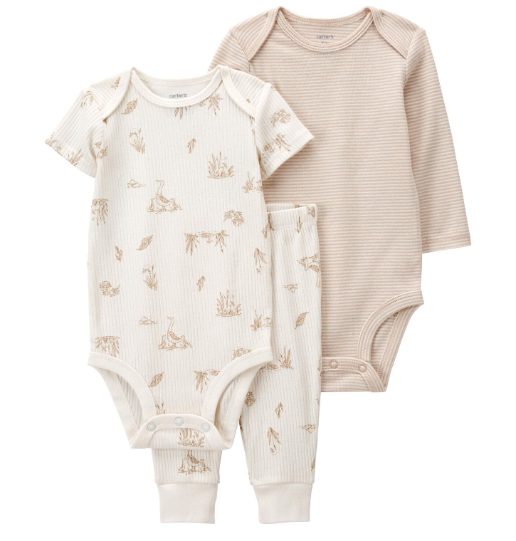 Incluye: 1 mameluco manga corta, 1 mameluco manga larga y 1 pantalón.