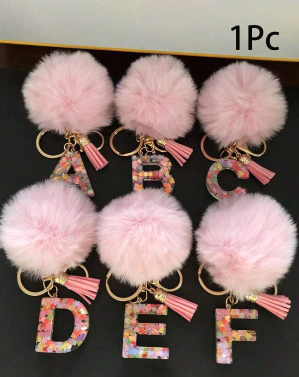 1 pieza Llavero con inicial de letra del alfabeto, llavero de pompón.